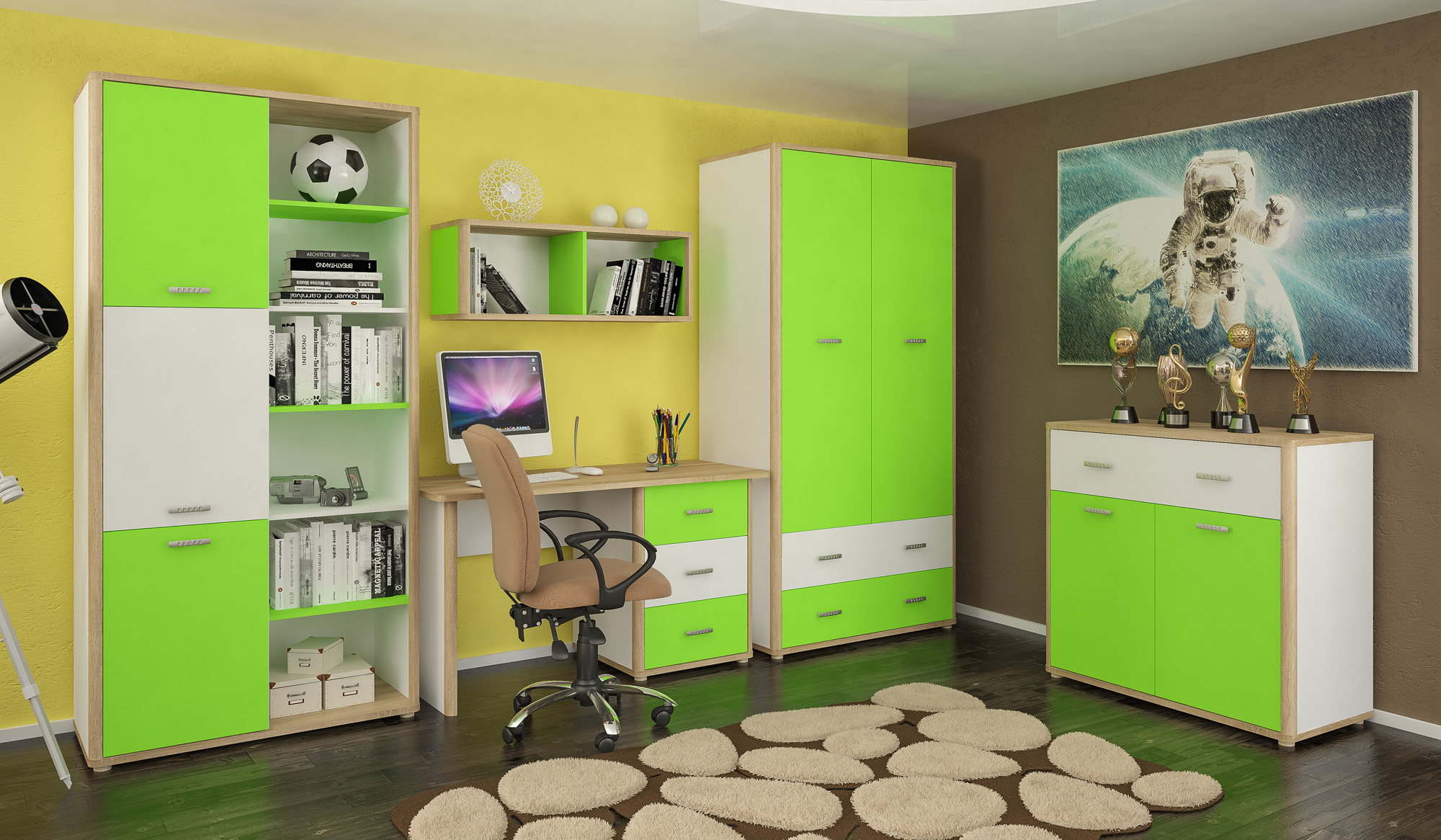 Leo child green v interЛаконічні форми меблів доповнені поєднанням білого кольору із текстурою Дуб Самоа. Акцент зроблено на фасадах системи. Універсальні форми меблів системи ЛЕО, дозволять заповнити приміщення зі смаком і комфортом.