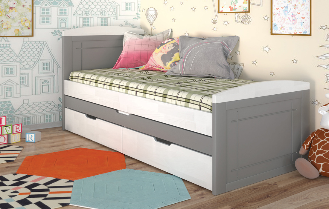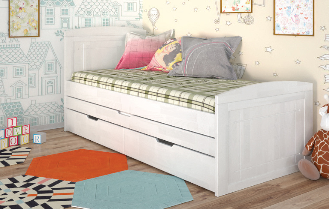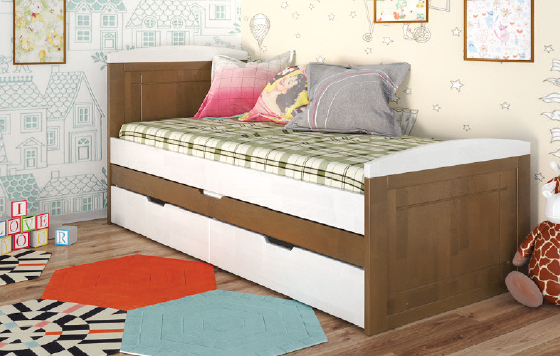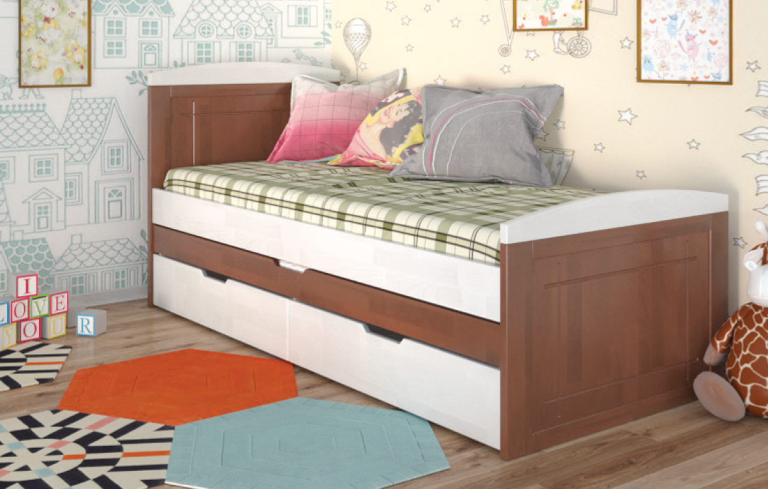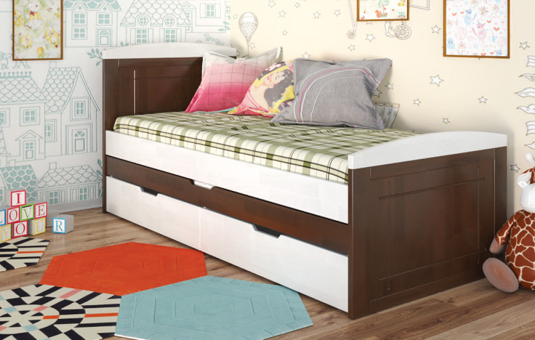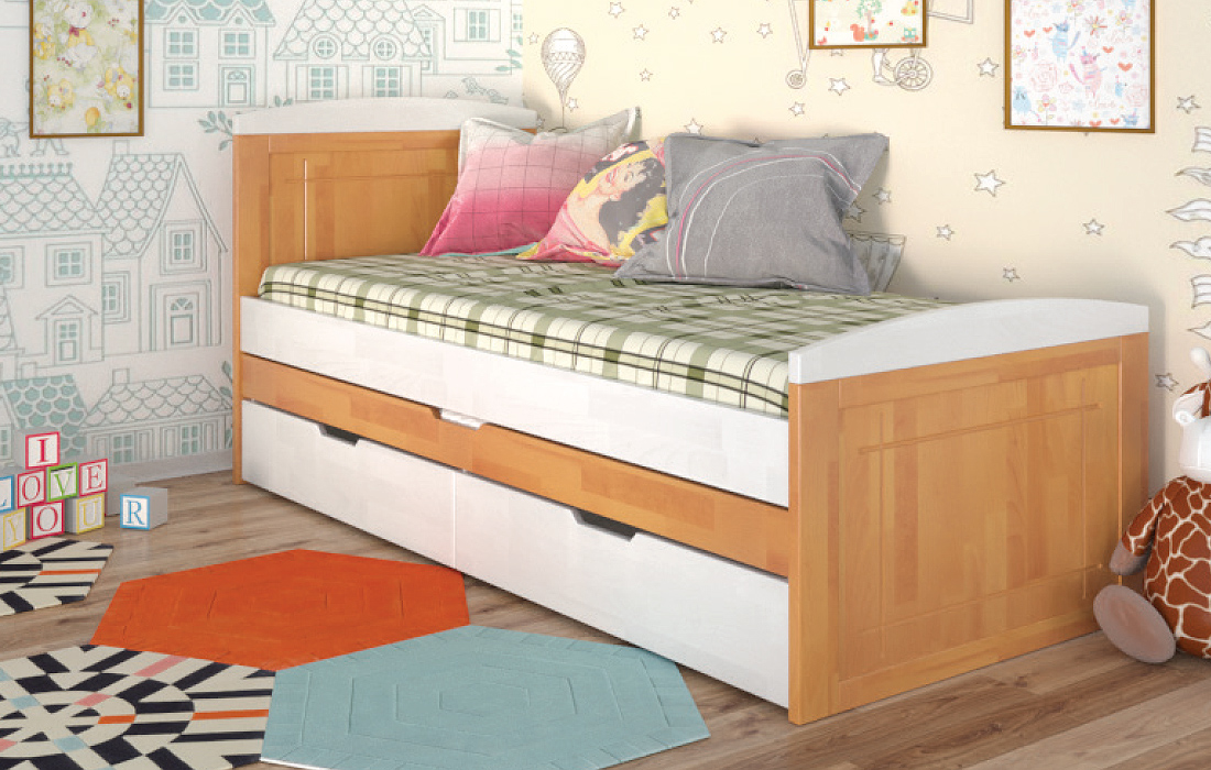Дерев'яне ліжко Компакт плюс - це ліжко з натурального дерева вищого сорту. Ліжко з натурального дерева - воістину розкішне придбання! Ліжко Compact Plus Arbor Drev - це стильне односпальне дитяче або підліткове ліжко, яке вигідно відрізняється унікальною конструкцією і високою функціональністю. На відміну від звичайних ліжок, ліжко укомплектовано додатковим висувним спальним місцем. Ліжко відмінно поєднує функції і дивана, і ліжка, що робить його незамінним для дитячої. Виконане з натурального дерева щит бука або сосни, на вибір, і покрите гіпоалергенним лаком італійського виробництва. Ліжко Компакт плюс Арбор Древ характеризується простим і сучасним дизайном, закругленими боковинами, додатковим спальним місцем, і двома висувними шухлядами. Дерев'яне ліжко "Компакт плюс" комплектується міцними гнутими ламелями товщиною 8 мм і відстанню між ними 3,8 см. Спальне місце під матрац в розмірі 80х190 см забезпечить комфортний сон для дорослого або дитини.